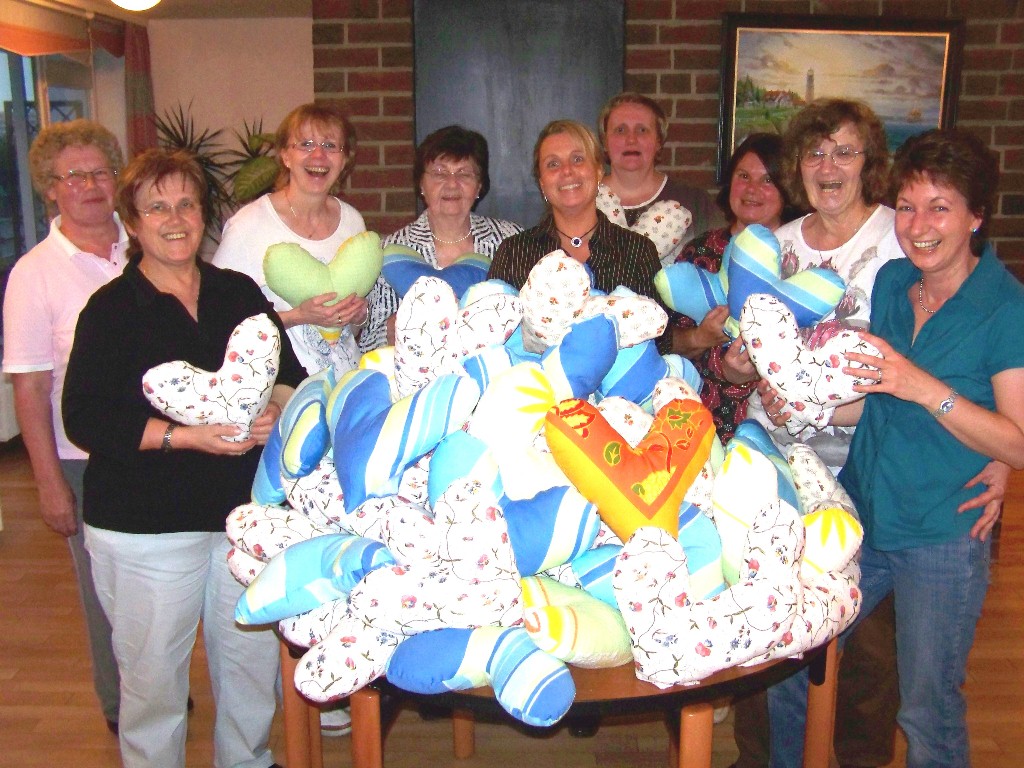 Die Lymph-Selbsthilfegruppe Bremen hat bei ihrem Treffen am 17.8.2011 im Stadtteilhaus Kattensch für die Aktion Herzen gegen Schmerzen, Herzförmige Kissen hergestellt, die an Frauen verteilt werden die an Brustkrebs erkrankt sind und operiert wurden. Diese Frauen tragen diese Herzkissen zur Entlastung der Operationsnarbe unter den Achseln.