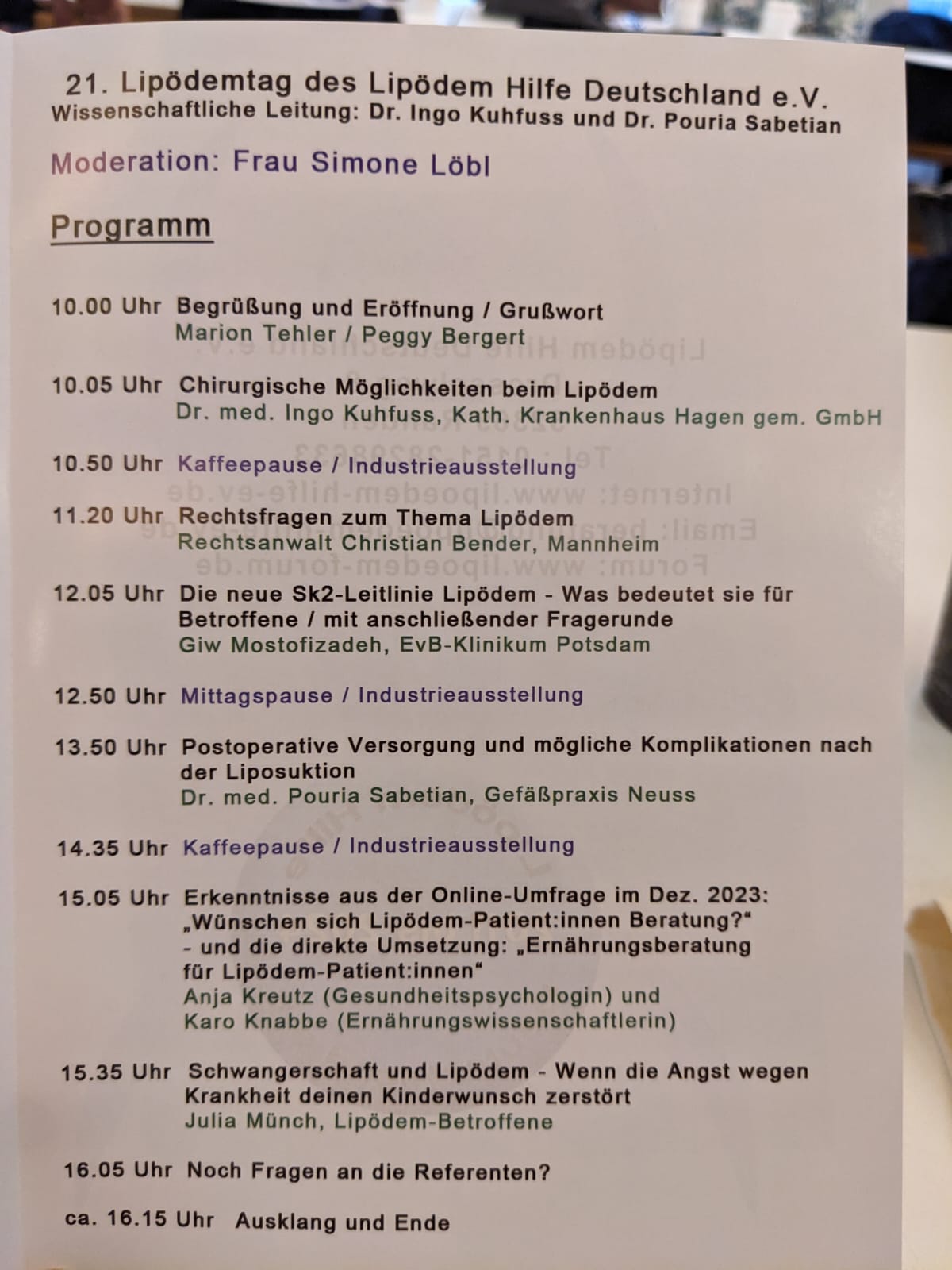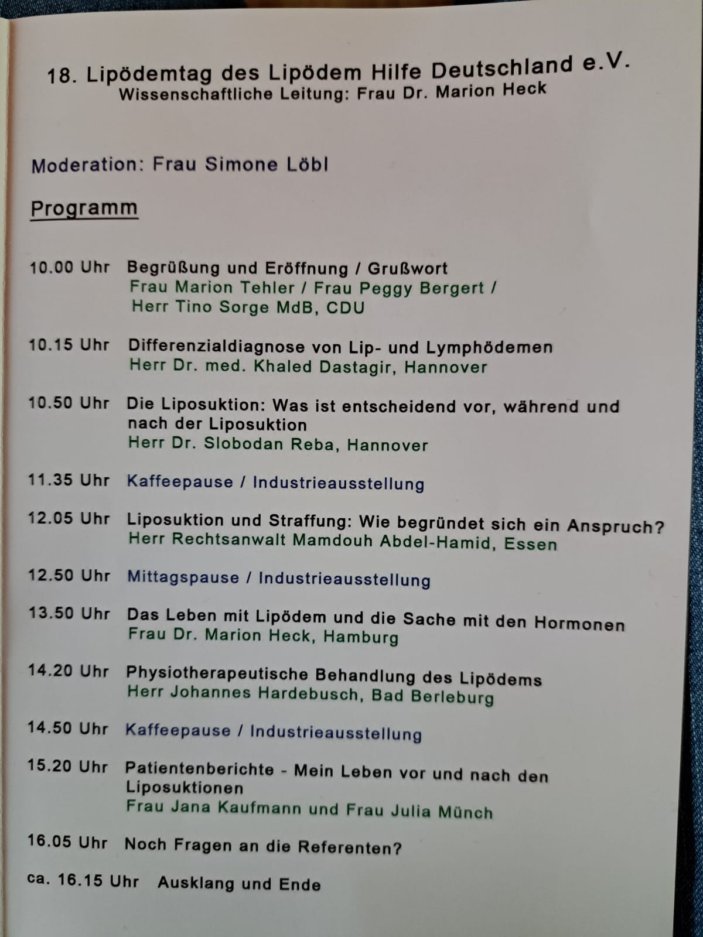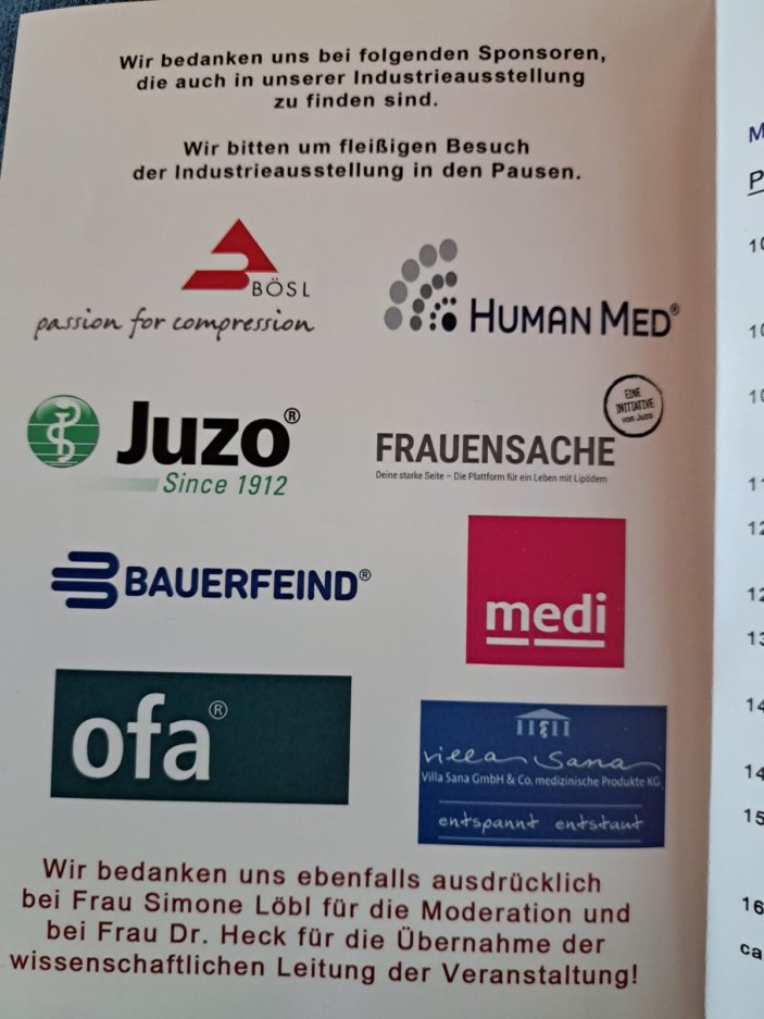Folgende Vorträge wurden angeboten: - Was gibt es Neues beim Lipödem? (Prof. Dr. W. Schmeller, Lübeck) - Probleme bei der ambulanten Therapie (Dr. A. Miller, Berlin) - Lipödem und Übergewicht: ein nicht operativer Therapieansatz
