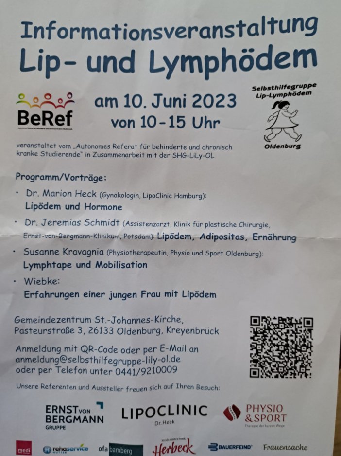 Die erste Veranstaltung für 2024 fand in Oldenburg statt. Organisiert wieder von der Selbsthilfegruppe in Oldenburg. Professor Dr. Steinsträßer hielt einen interessanten Vortrag zum Thema Lipödem. Die Physiotherapeutin Alina Brodehl zeigte uns die so unglaublich wichtige Eigenbehandlung. Susanne Schöpper von den Sockenweibern weihte uns in die Geheimnisse der Kompressionstherapie ein. Andreas Heye von der Firma Medi erklärte die adaptierte Kompression und hatte einen Informationsstand.Wir freuen uns schon auf die nächste Veranstaltung in Oldenburg.